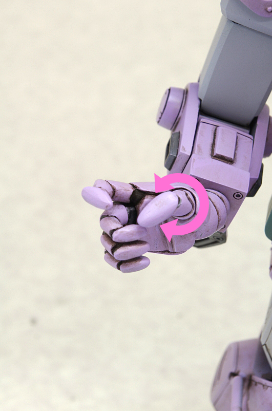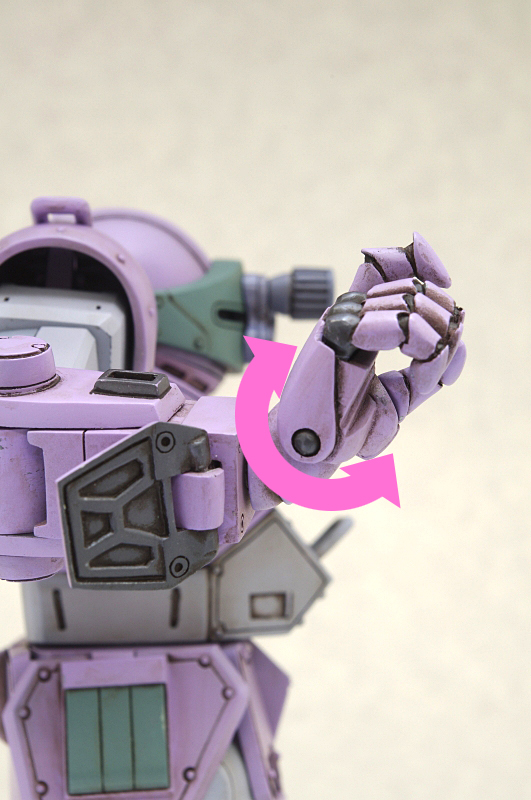 特に、武装の持ち手は、ロッグガンを持ちやすいように「手首」に予め角度が付いていたり、その手首の付け根にも可動ポイントが設けられていたりもします。