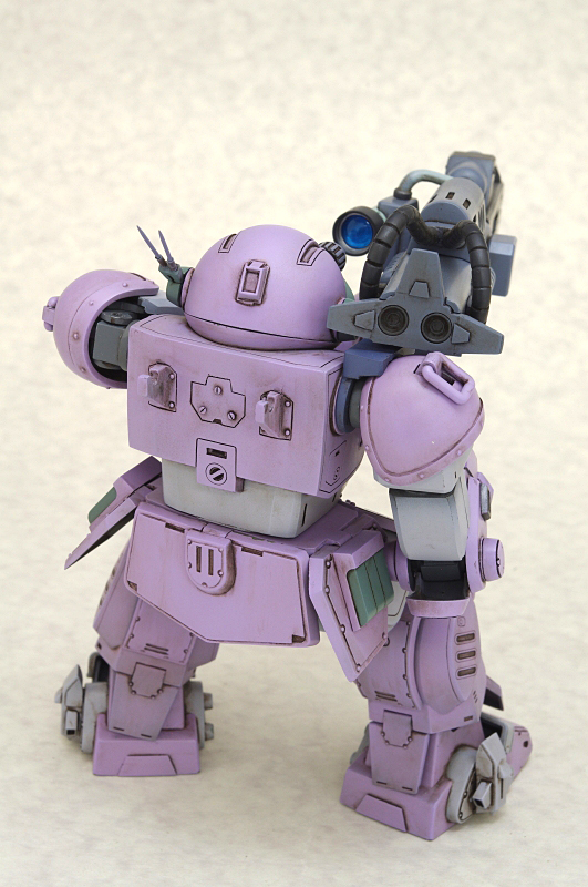 その後長く紡がれていくこととなるボトムズというストーリーの中で、最初も最初の第1話に1回登場したきりというレア中のレアな兵器でありながら、その出鱈目な性能により知名度・ファンも意外に多いロッグガン。いざ立体になるとその凄味も一倍強調され、これぞSFメカというゴテゴテ感も非常に見応えがあり、その情報量の多さから意外にも模型向きな題材だったのだなと感じます。今回、只野☆慶氏が、そのボトムズ史においても一際異彩を放つロッグガンを、細かなディテールからそのシルエットに至るまで完全再現しただけではなく、その手腕はそれを構えるスコープドッグにまでおよび、造形面だけではなく機能面においてまでこだわりぬいて製作しています。